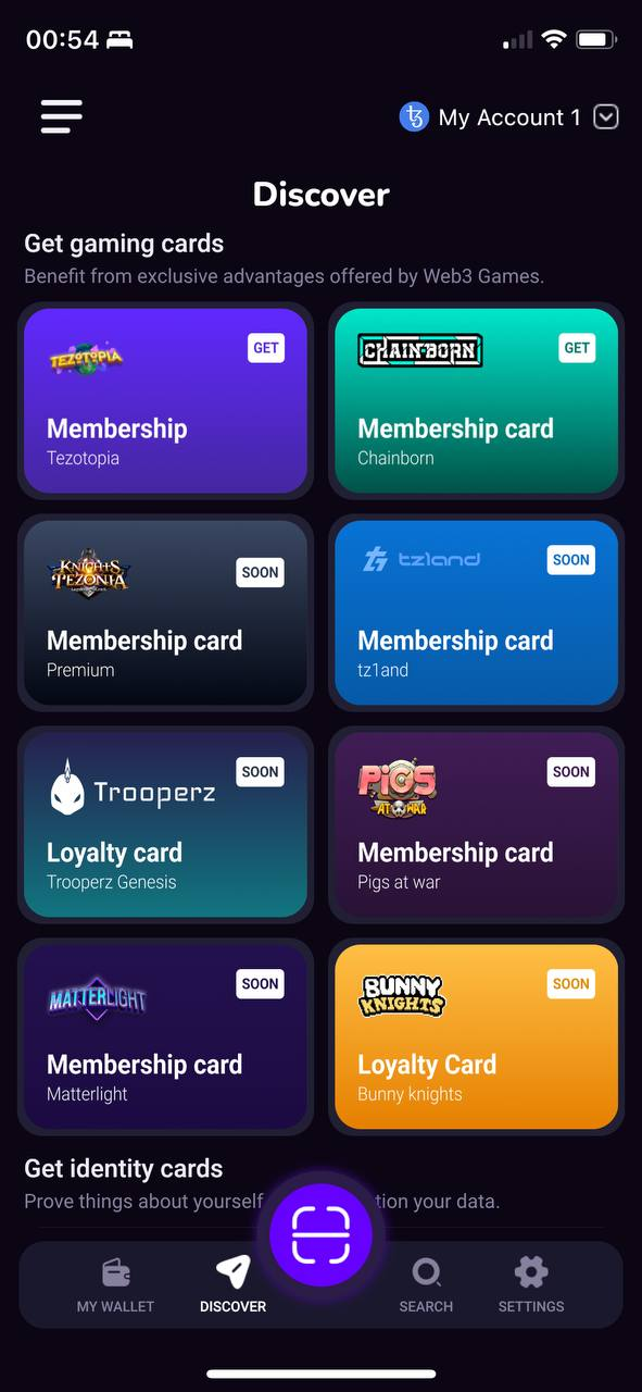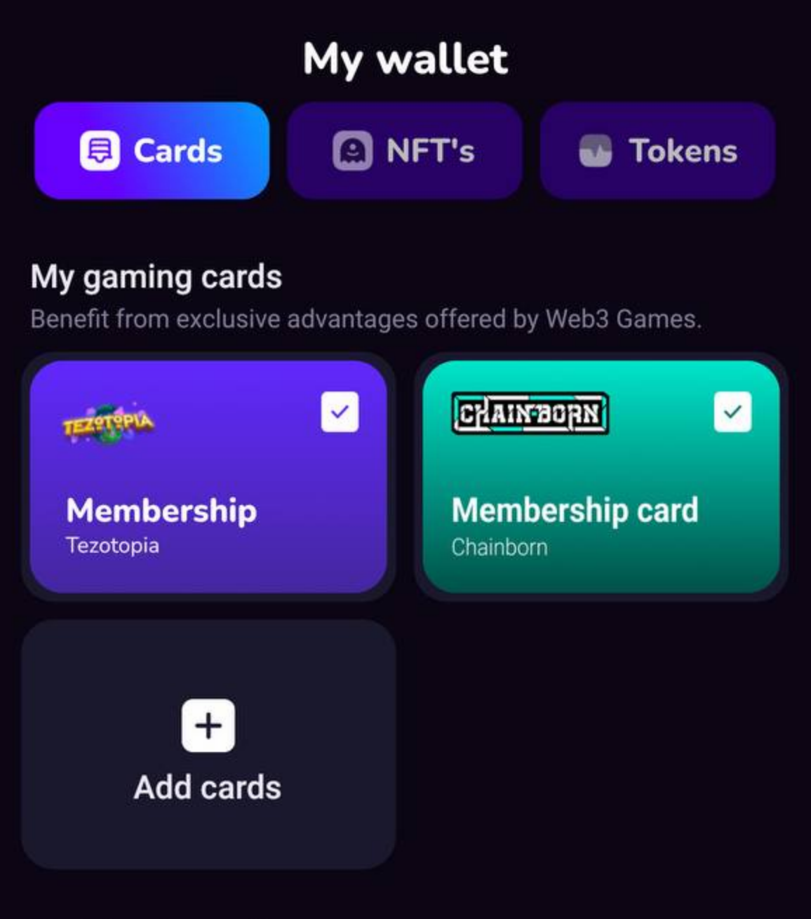 У розділі Gaming Cards відображаються карти лояльності блокчейн-ігор на Tezos: Tezotopia, Chainborn, Pigs at War та інших. Щоб отримати їх, потрібно надати відповідні Identity Cards. Наприклад, для карти лояльності Tezotopia потрібно надати докази країни проживання та віку, а їх можна отримати в розділі Identity Cards.