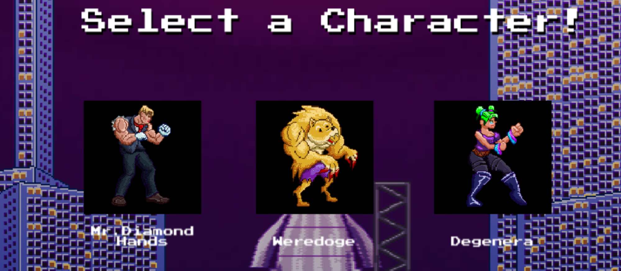 Спочатку треба обрати одного із трьох персонажів: Mr. Diamond Hands, Weredoge та Degenera. За відчуттями, найсильніший і найжвавіший — Weredoge.