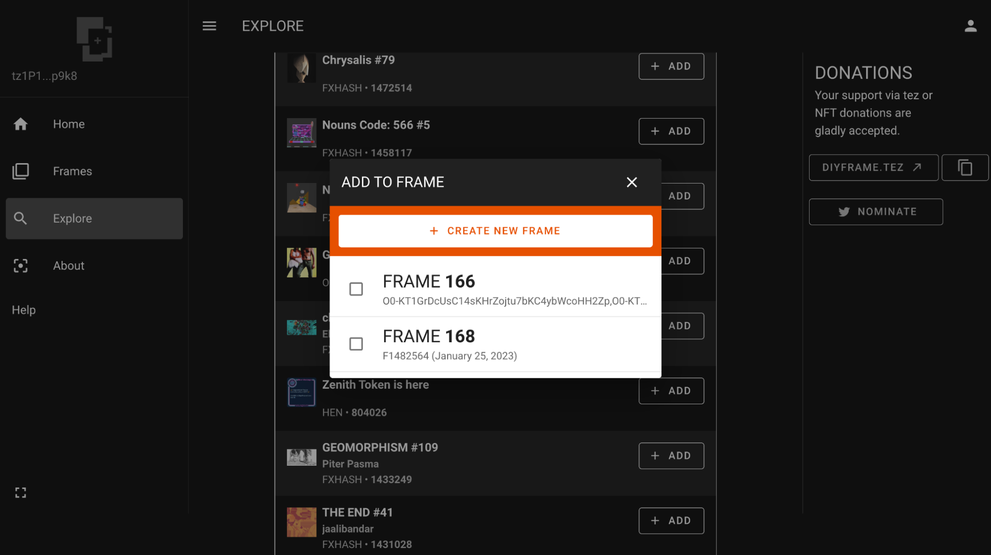 За допомогою DIYFRAME користувач генерує посилання на рамочку (frame) із вибраними NFT. У рамочці може бути один токен або кілька — в цьому випадку токени будуть через деякий час змінювати один одного при перегляді.