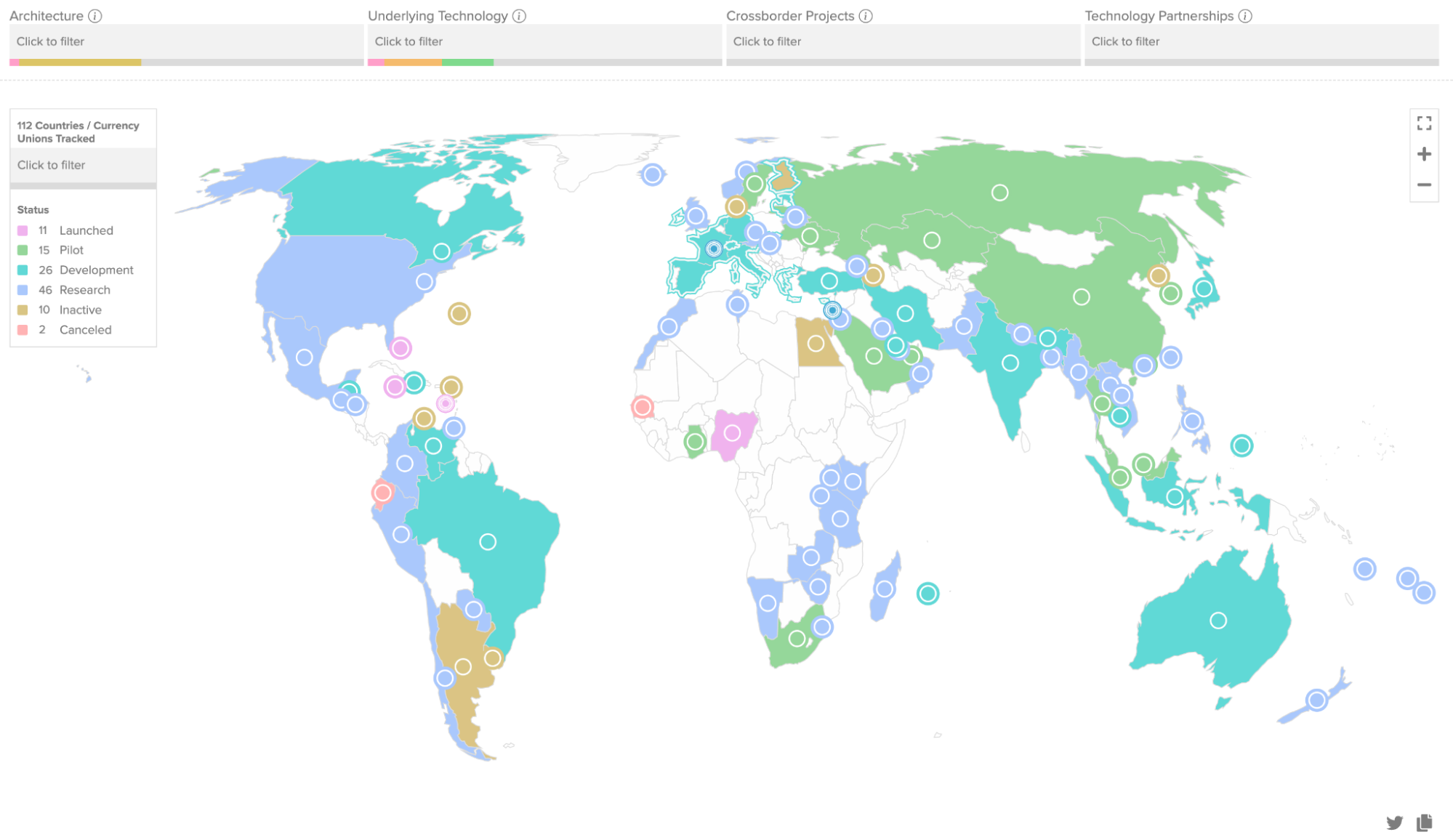 На сайті Atlantic Council є інтерактивна карта країн, на якій відзначено прогрес у розробці та впровадженні цифрових грошей.