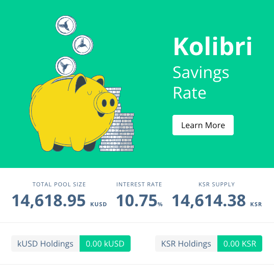При кожному депозиті чи виведенні kUSD смарт-контракт Kolibri Savings Rate забирає kUSD зі стабілізаційного фонду Kolibri. Кількість kUSD на контракті Kolibri Savings Rate зростає швидше, ніж кількість KSR на руках у користувачів, що забезпечує 10,75% річних у kUSD при погашенні KSR.