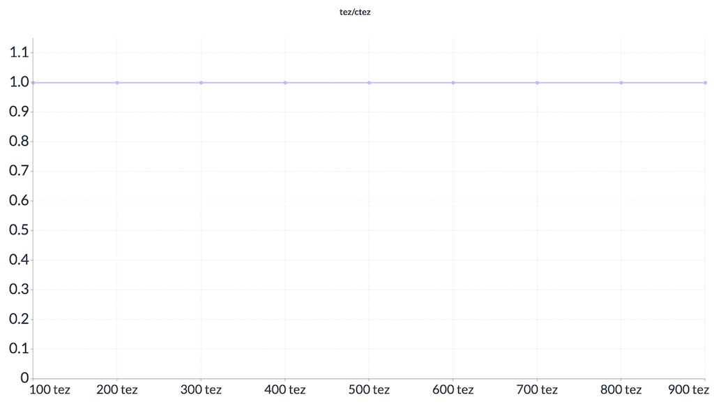 Для стейблкоїнів та синтетичних активів з однаковою вартістю краще використовувати іншу формулу: Y + X = K, так звану Constant Sum Market Maker. Наприклад, при обміні ctez на tez графік буде виглядати як пряма лінія: за кожен ctez користувач отримає один tez.