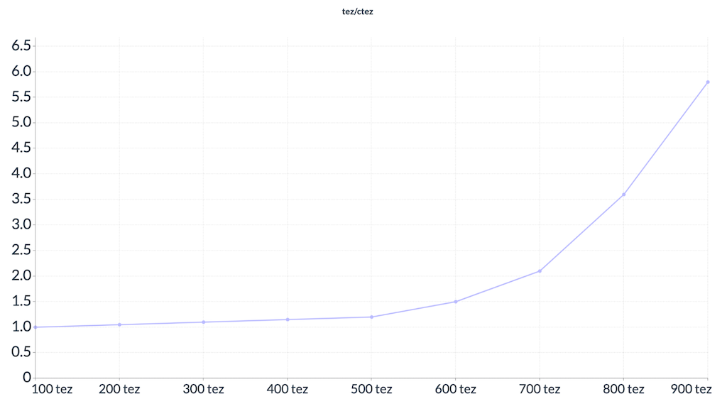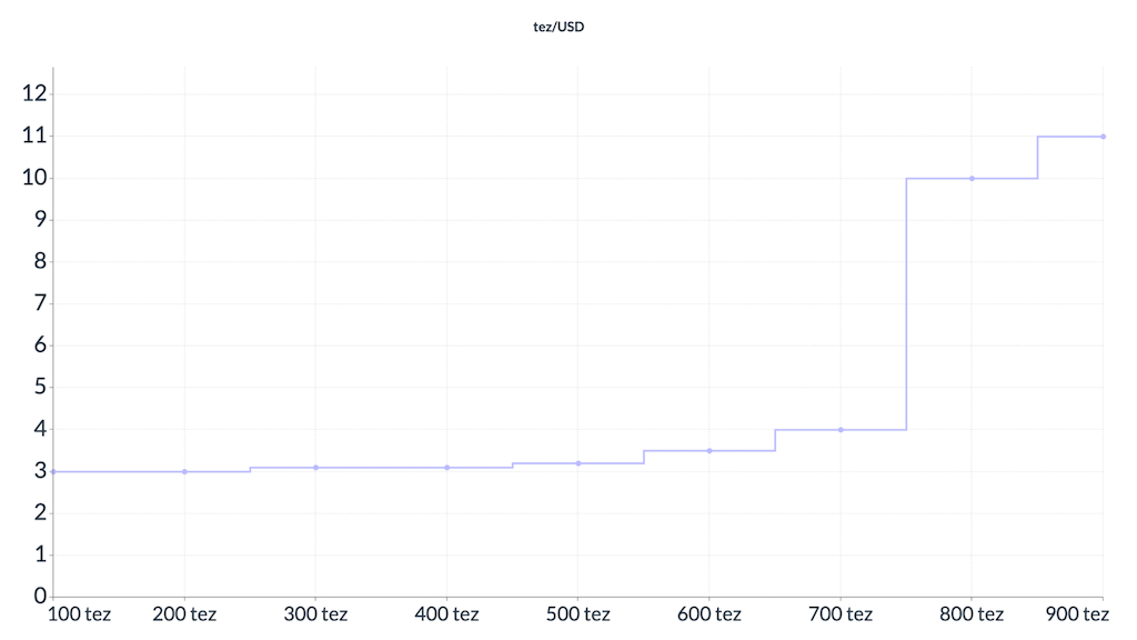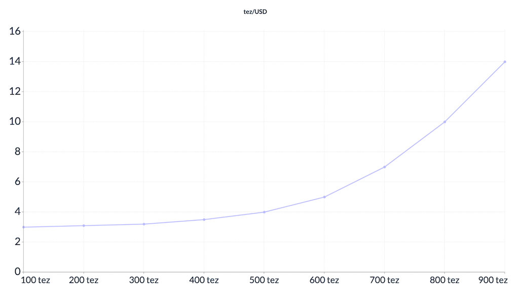 Чим більше tez потрібно купити, тим більше USD потрібно заплатити за кожний наступний tez. Якщо користувач захоче купити все tez в пулі, ціна останнього tez буде сягати нескінченності.