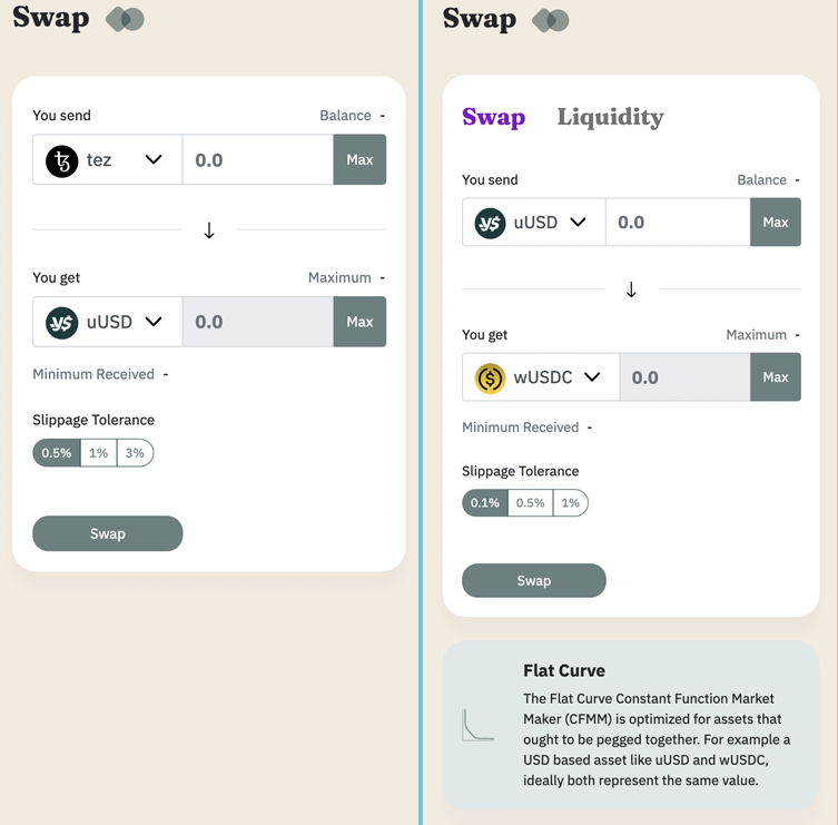 Такий вид АММ в екосистемі Tezos використовують Plenty для обміну ctez на tez та youves для обміну стейблкоїнів та синтетичного BTC. Flat Curve на youves доступний для таких активів: