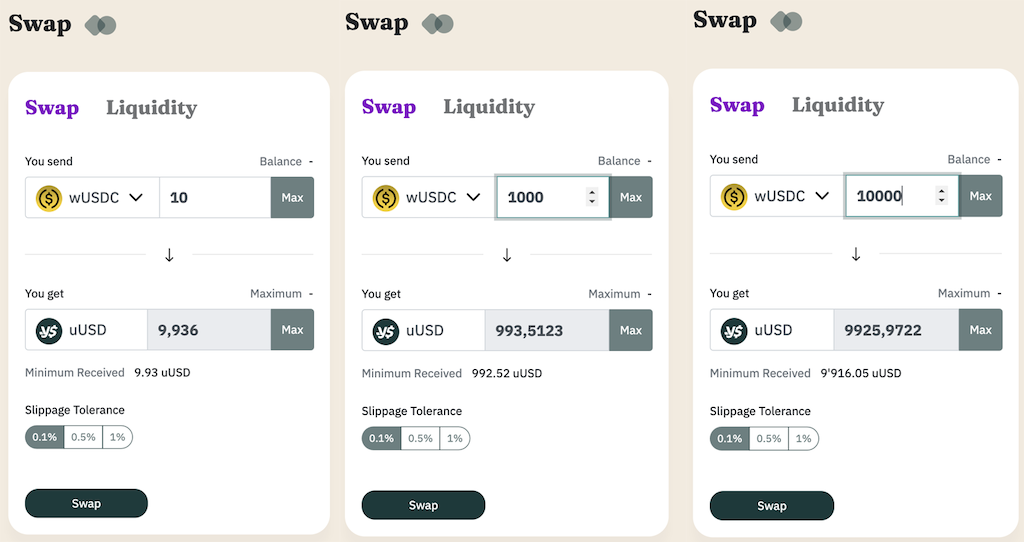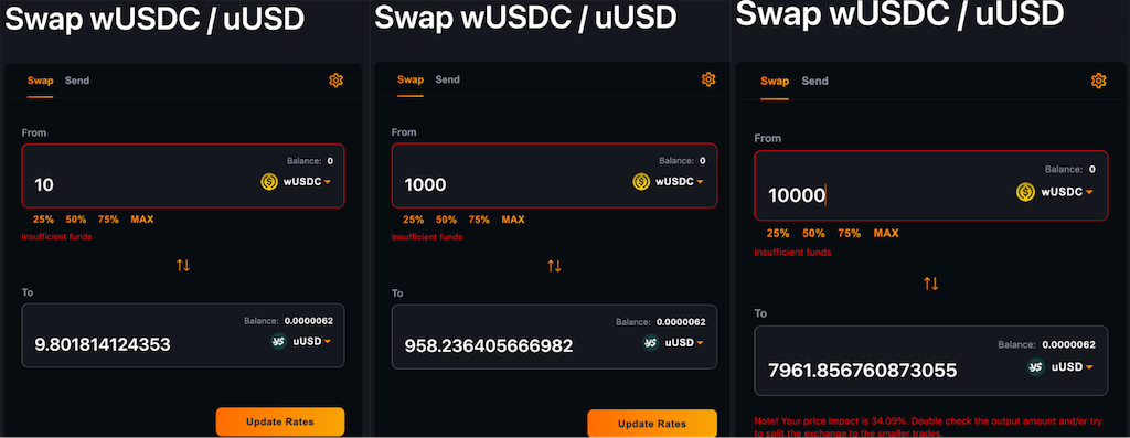 При обміні 10 000 wUSDC на uUSD через Flat Curve ціна зміниться на 0,2% від ринку.