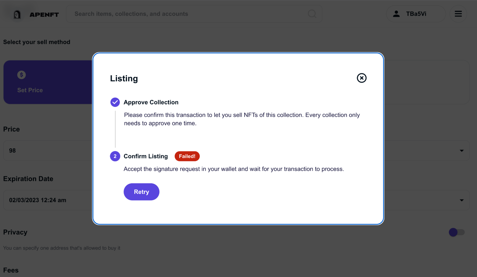Однак при спробі виставити токен на продаж щось пішло не так з вини маркетплейсу APENFT або гаманця Tronlink.