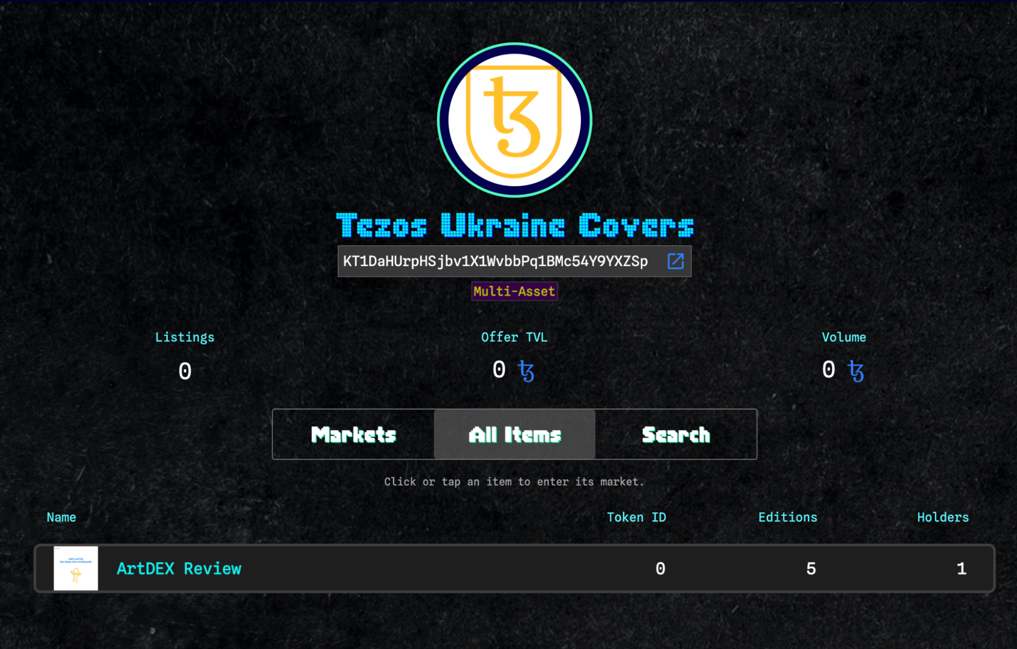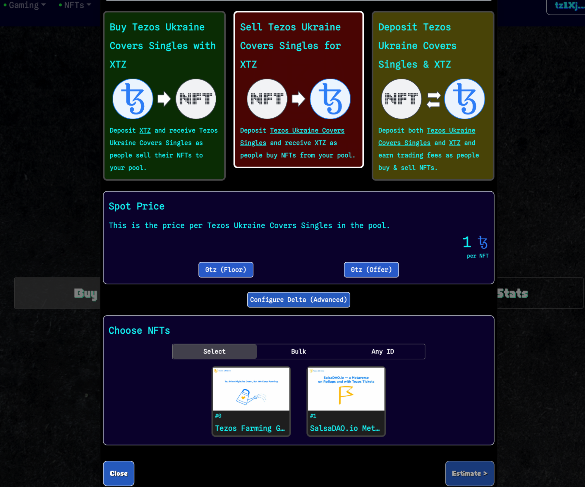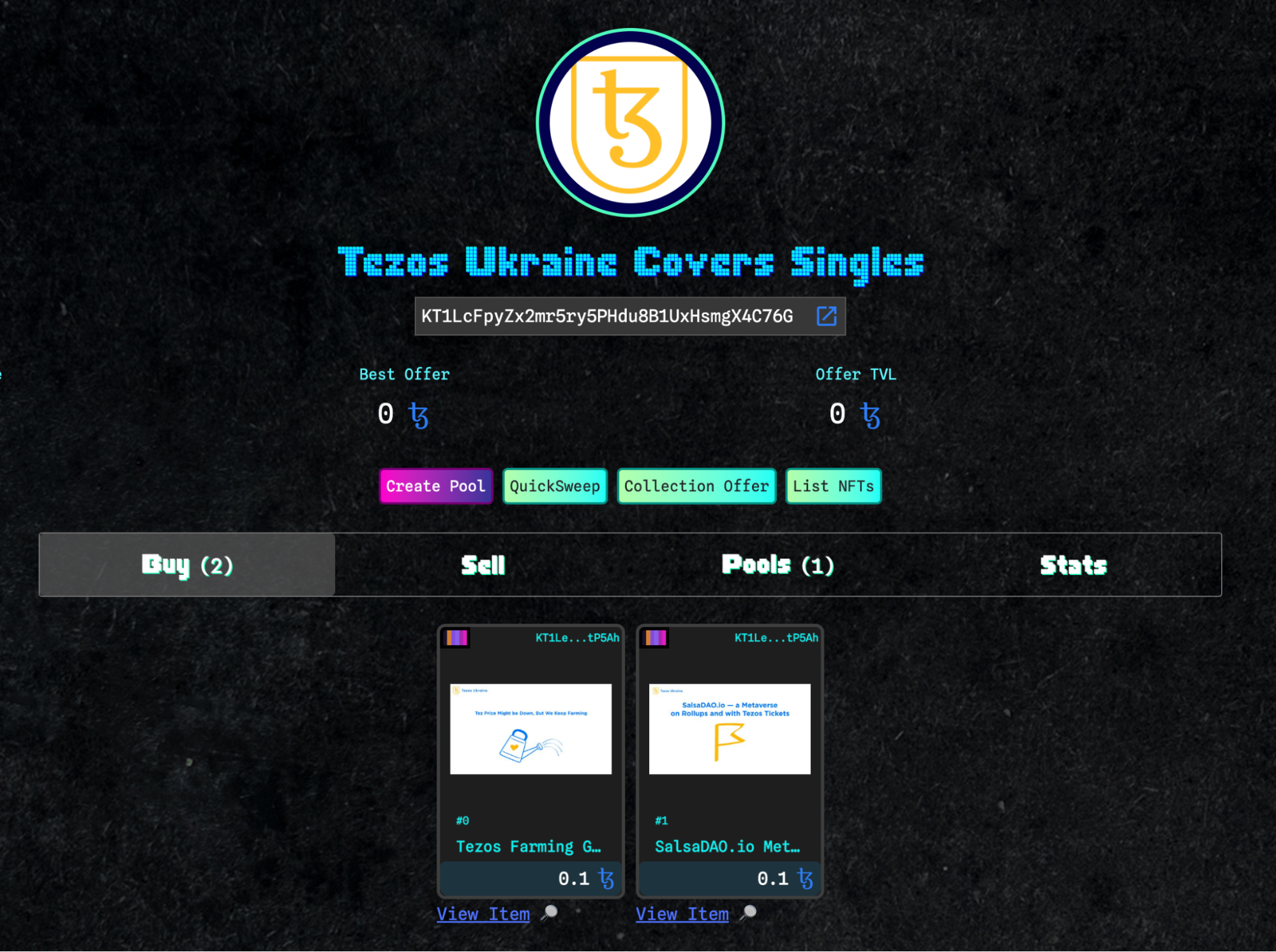 Для прикладу ми створили на OBJKT окрему колекцію Tezos Ukraine Covers Singles і змінтили в неї два токени з параметром Editions 1. Після цього при створенні пула ми можемо вибрати всі NFT з колекції, які хочемо до нього внести.