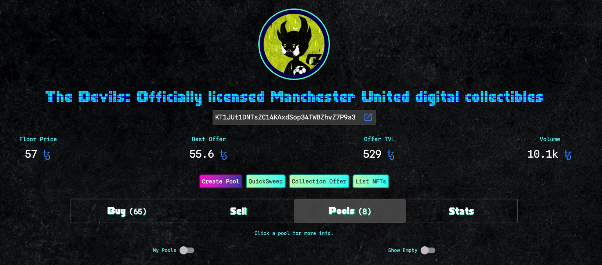 Потім на сторінці колекції натиснути фіолетову кнопку Create Pool, вказати його параметри та додати NFT або tez зі свого гаманця.