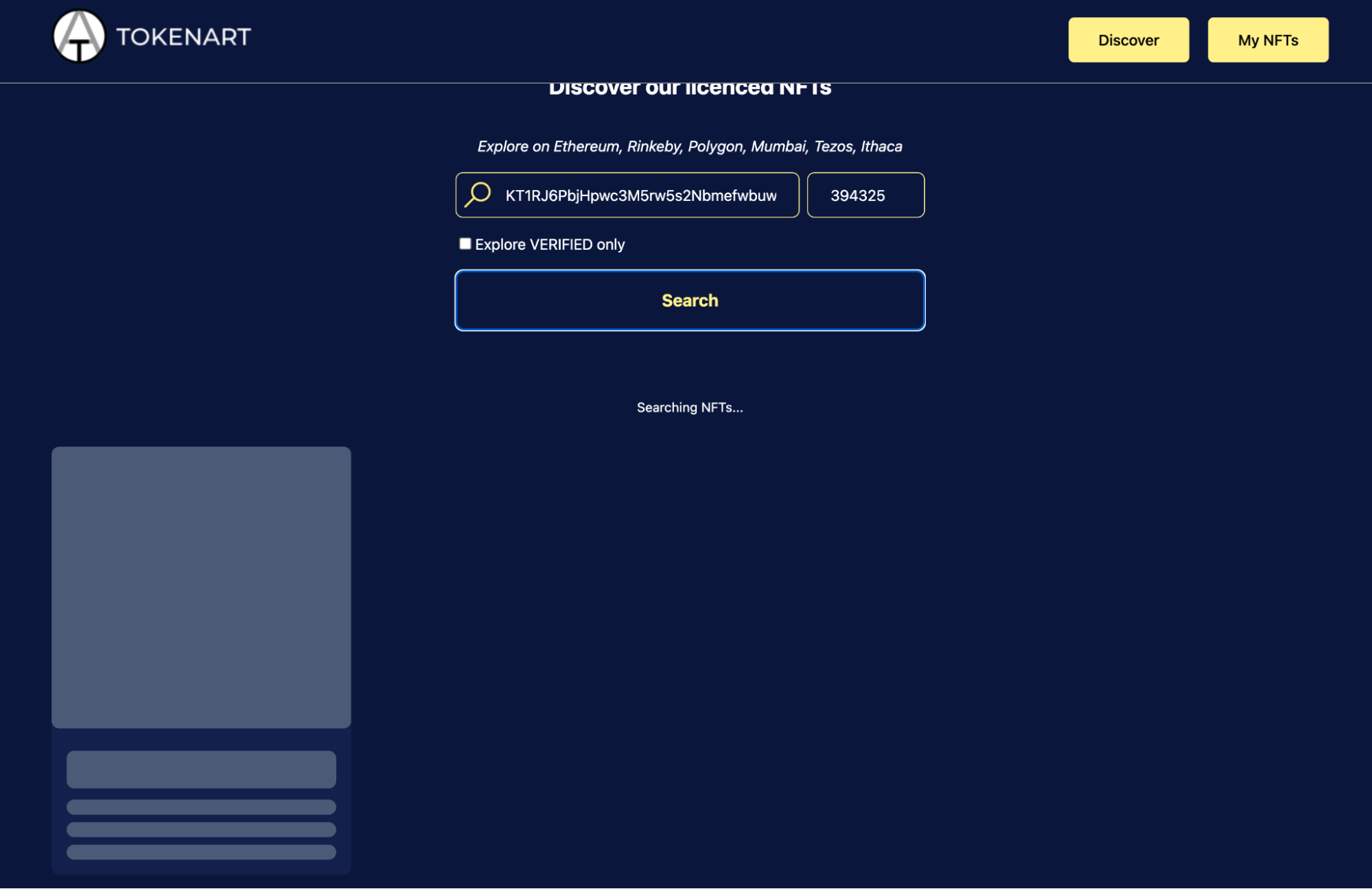 Tokenart — децентралізований проєкт для ліцензування та перегляду ліцензій на NFT. Платформа починала з колекцій на Ethereum, а зараз додала Tezos та інші блокчейни. Tokenart все ще у беті: вона знаходить колекції на Tezos за їхньою назвою, але не відображає самі об’єкти.