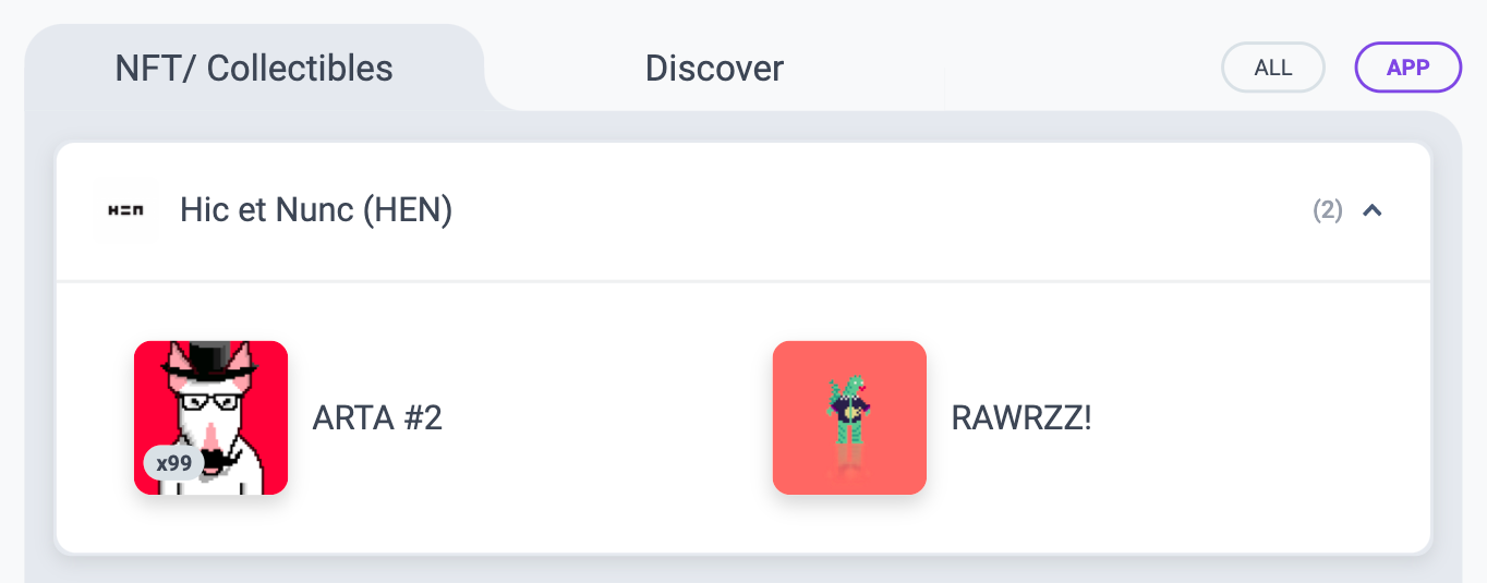 Через те, що попередні версії гаманців фокусувались на взаємозамінних токенах, NFT показувалися у вигляді назви та логотипу контракту-мінтера. Різні NFT з одного маркетплейса виглядали як взаємозамінні токени. Але зараз гаманці типу Kukai 2.0 запровадили біль дружелюбний інтерфейс: вони виносять звичайні токени та NFT в різні вкладки, а також підтримують попередній перегляд токенізованих активів.