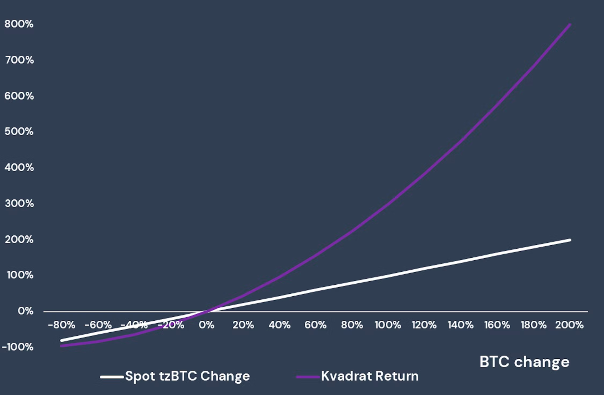 Kvadrat — це спекулятивний безстроковий інструмент від розробників лендингового сервісу Kord.fi. Kvadrat надає користувачам довгі позиції tzBTC з експозицією в квадраті. Буквально: якщо курс tzBTC зросте вдвічі, утримувач позиції заробить у чотири рази більше.