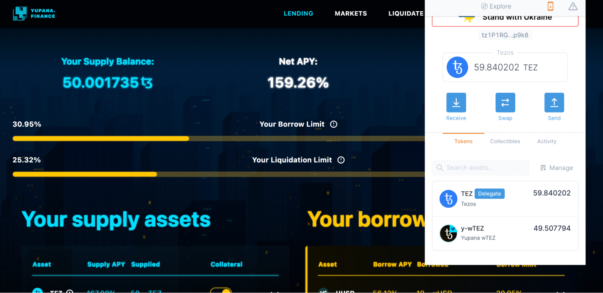 Внизу екрана знаходиться інтерфейс для роботи: таблиця ліворуч — депозити, праворуч — позики. Щоб внести активи, потрібно натиснути стрілку під потрібним токеном, потім натиснути кнопку Supply, ввести кількість токенів і підтвердити транзакцію в гаманці. З цього моменту Yupana почне нараховувати прибуток на депозит.