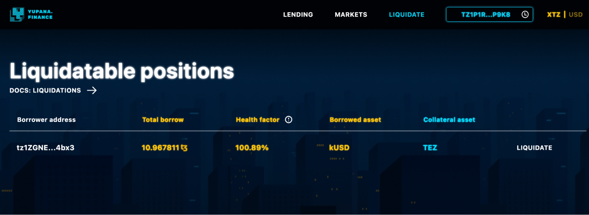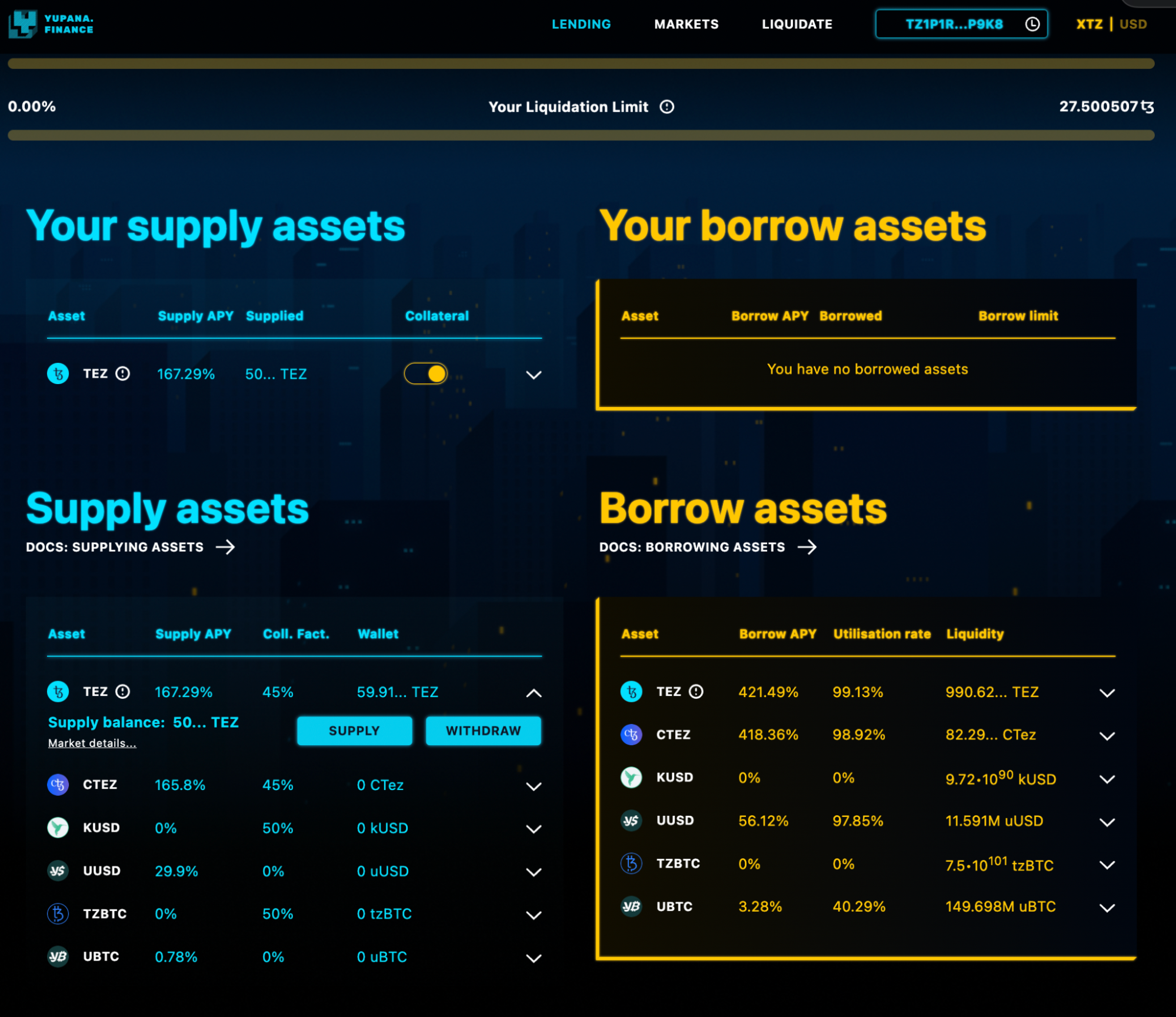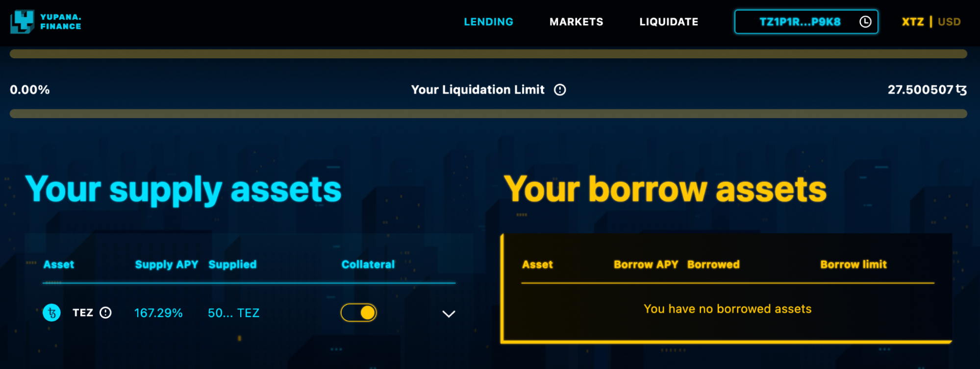 Розробники вивели весь інтерфейс однією екран. Зверху зображається ваш депозит у протоколі Yupana, вартість позичених коштів, доступний обсяг позики та ліміт до ліквідації.