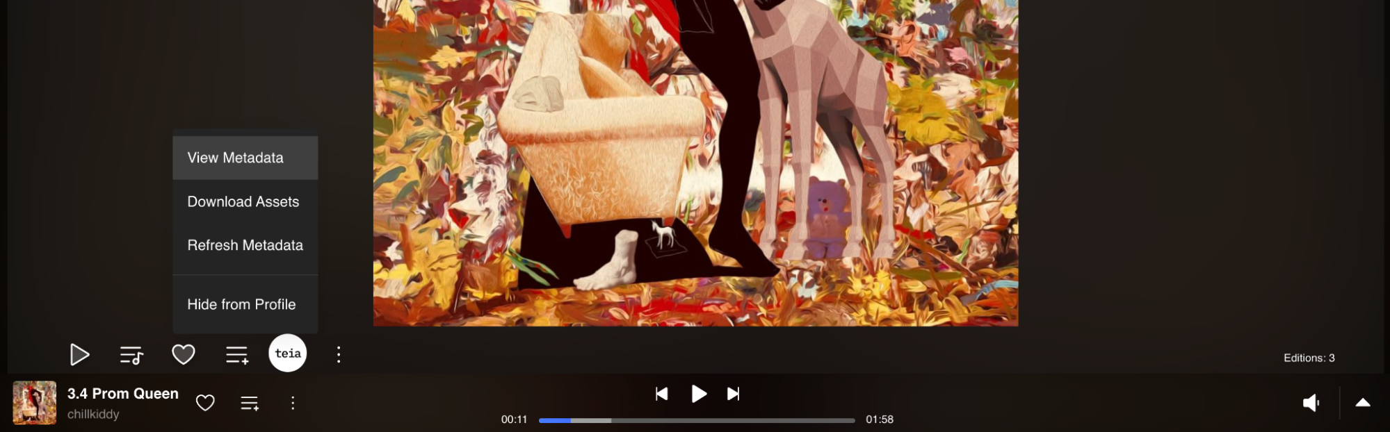 На тій же панелі в нижній лівій частині екрана трек можна додати до плейлисту, поставити йому лайк і перейти на платформу, щоб купити NFT. Після натискання на три точки відкривається додаткове меню для завантаження оригінального треку та обкладинки, а також для роботи з метаданими токена.