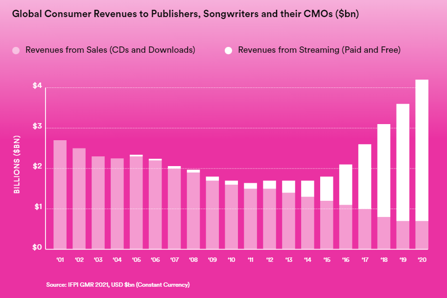 Ринок музики працює інакше. На Spotify, YouTube Music, Soundcloud, iTunes та подібних сервісах все пов’язано на прослуховуваннях. Їхня монетизація непряма: слухаєш безкоштовно музику з рекламою впереміш, або купуєш підписку і слухаєш що завгодно без реклами.