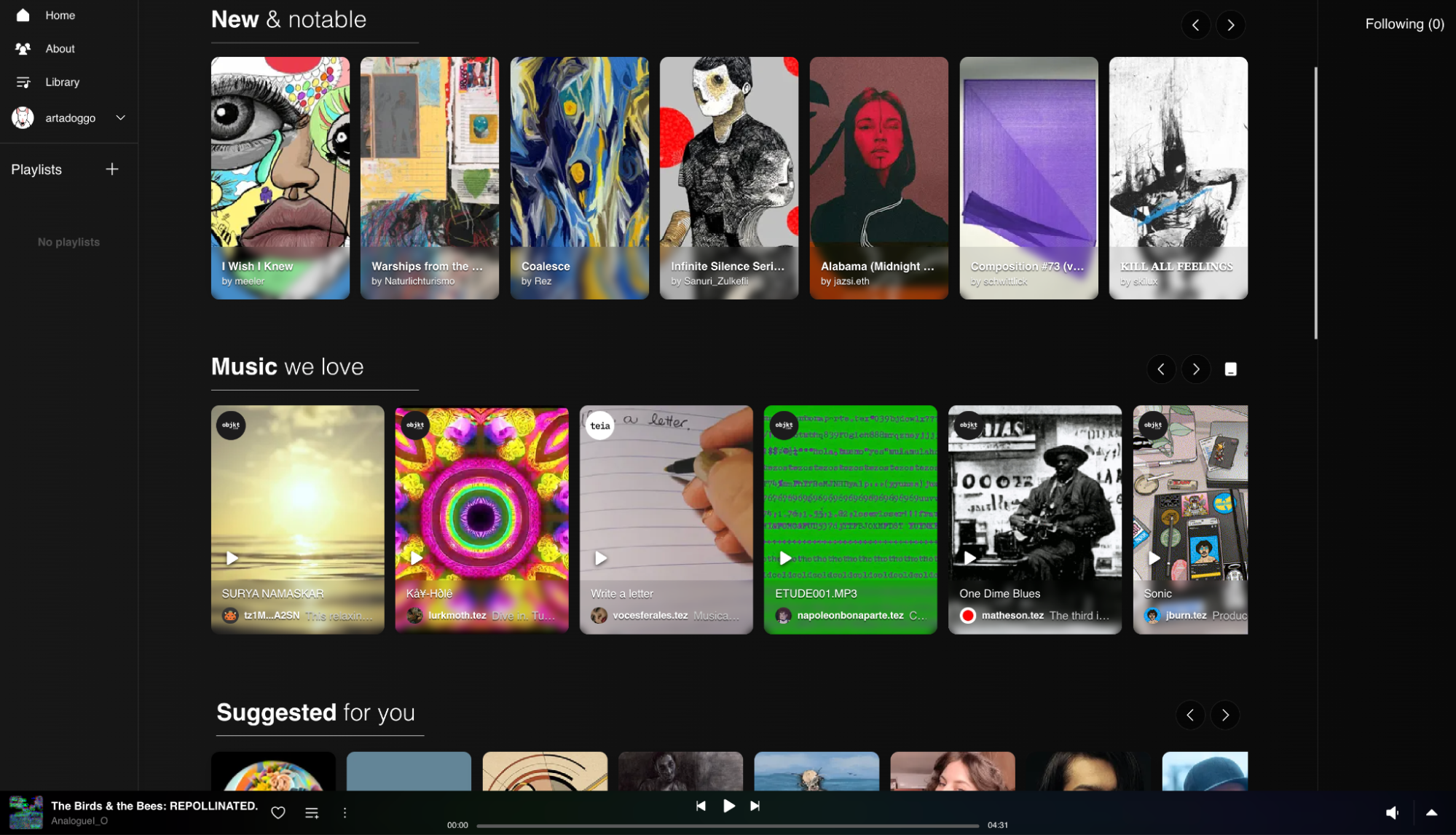 Музичні ресурси використовують пряму монетизацію — слухаєш безкоштовно та купуєш треки, щоб підтримати виконавця. На Tezos музику можна знайти на OBJKT.com та Teia, а також на плеєрі DNS.xyz.