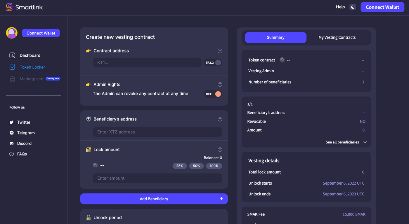 Для використання Token Locker потрібно заплатити комісію у розмірі 15 000 SMAK ($115). Автор роздачі задає умови вестингу, а Token Locker у кожному блоці відправляє токени на вказані адреси.