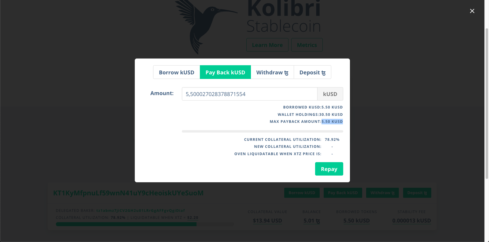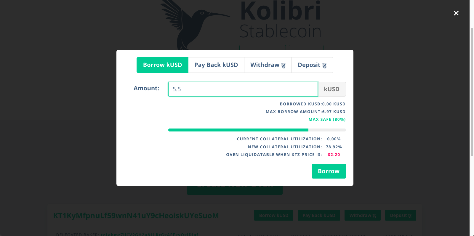 Щоб забрати з пічки стейблкоїни, потрібно натиснути кнопку «Borrow kUSD». Kolibri попередить користувача, якщо він захоче випустити kUSD на більш ніж 80% від максимальної суми. Це небезпечно: якщо ціна tez впаде на 20%, платформа ліквідує пічкуі депозит в tez. Коефіцієнт застави можна збільшити, якщо повернути в пічку частину kUSD або внести додатковий депозит.