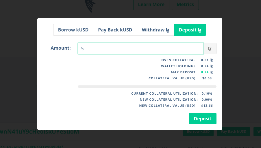 Для випуску kUSD потрібно внести депозит: натиснути на кнопку «Deposit», ввести кількість tez і підтвердити транзакцію.
