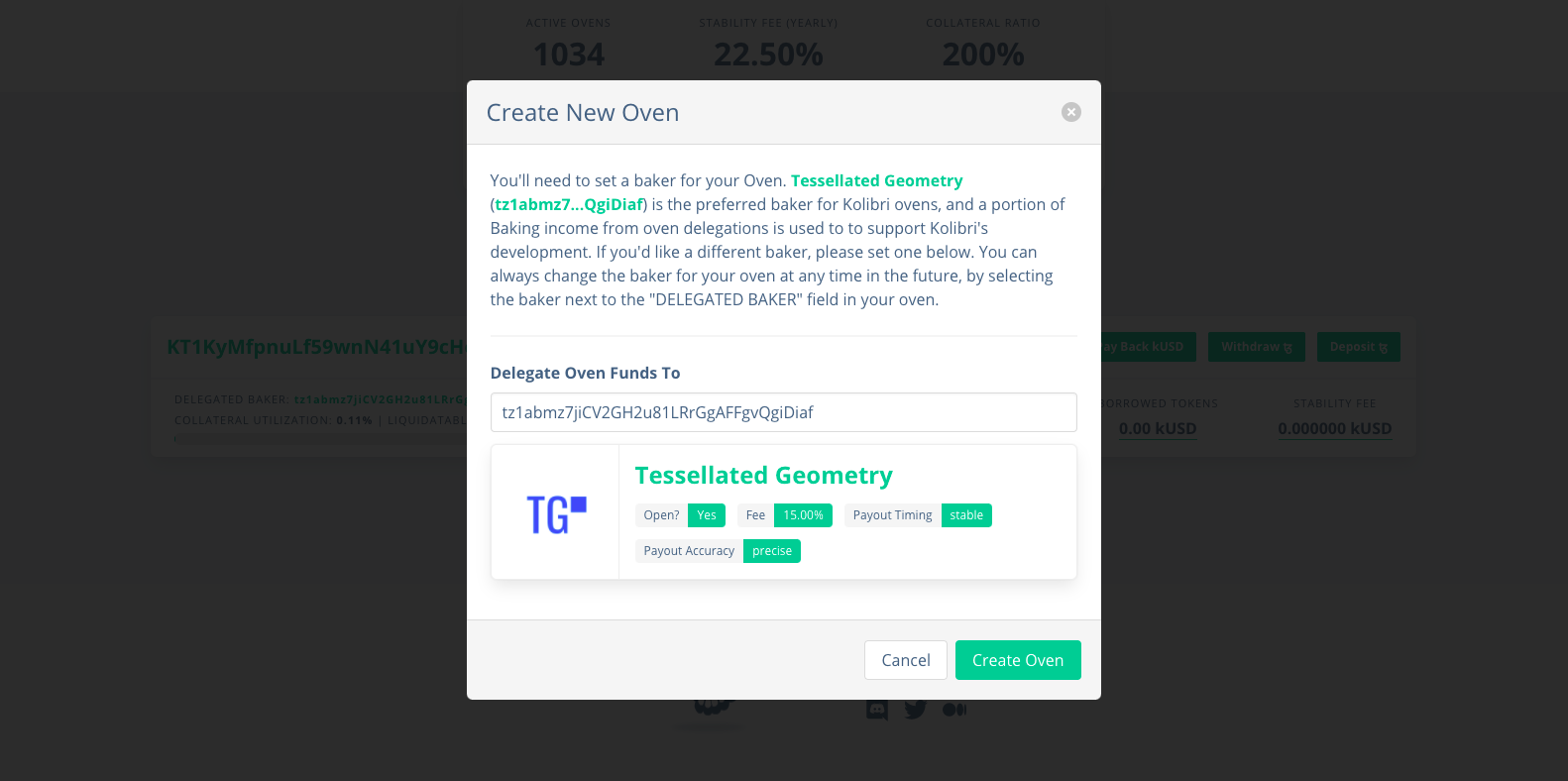 Щоб створити пічку, потрібно зайти на сайт Kolibri.finance і натиснути кнопку «Create New Owen». Kolibri запропонує прийняти бейкера за замовчуванням або вказати його адресу самостійно.