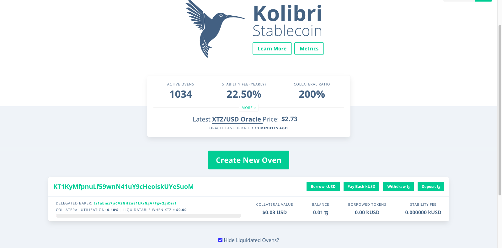 Kolibri (kUSD) — алгоритмічний стейблкоїн з прив’язкою до долара США і депозитом в tez. Користувачі самостійно випускають kUSD за допомогою спеціальних смарт-контрактів — печей (ovens). Для цього власник tez створює пічку, вносить в неї заставу і забирає kUSD. Максимальний коефіцієнт застави становить 200%: за кожен $1 на депозиті користувач може забрати до $0,5 в kUSD.