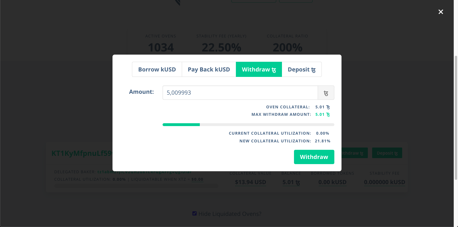 Після повернення kUSD потрібно натиснути «Withdraw» і вказати кількість tez для виведення. Швидше за все, на адресу пічки залишиться близько 0,000001 tez. Це нормально: Kolibri стягує комісію стабілізаційного фонду при кожному додаванні блоку. Платформа встигне нарахувати невелику заборгованість за час підтвердження транзакції.