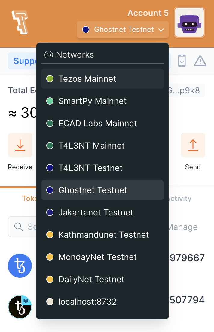 Спочатку потрібно завести гаманець у тестовій мережі Ghostnet. Якщо ви користуєтеся Temple Wallet, просто перемкніть мережу у своєму акаунті та отримайте тестові tez із крана.