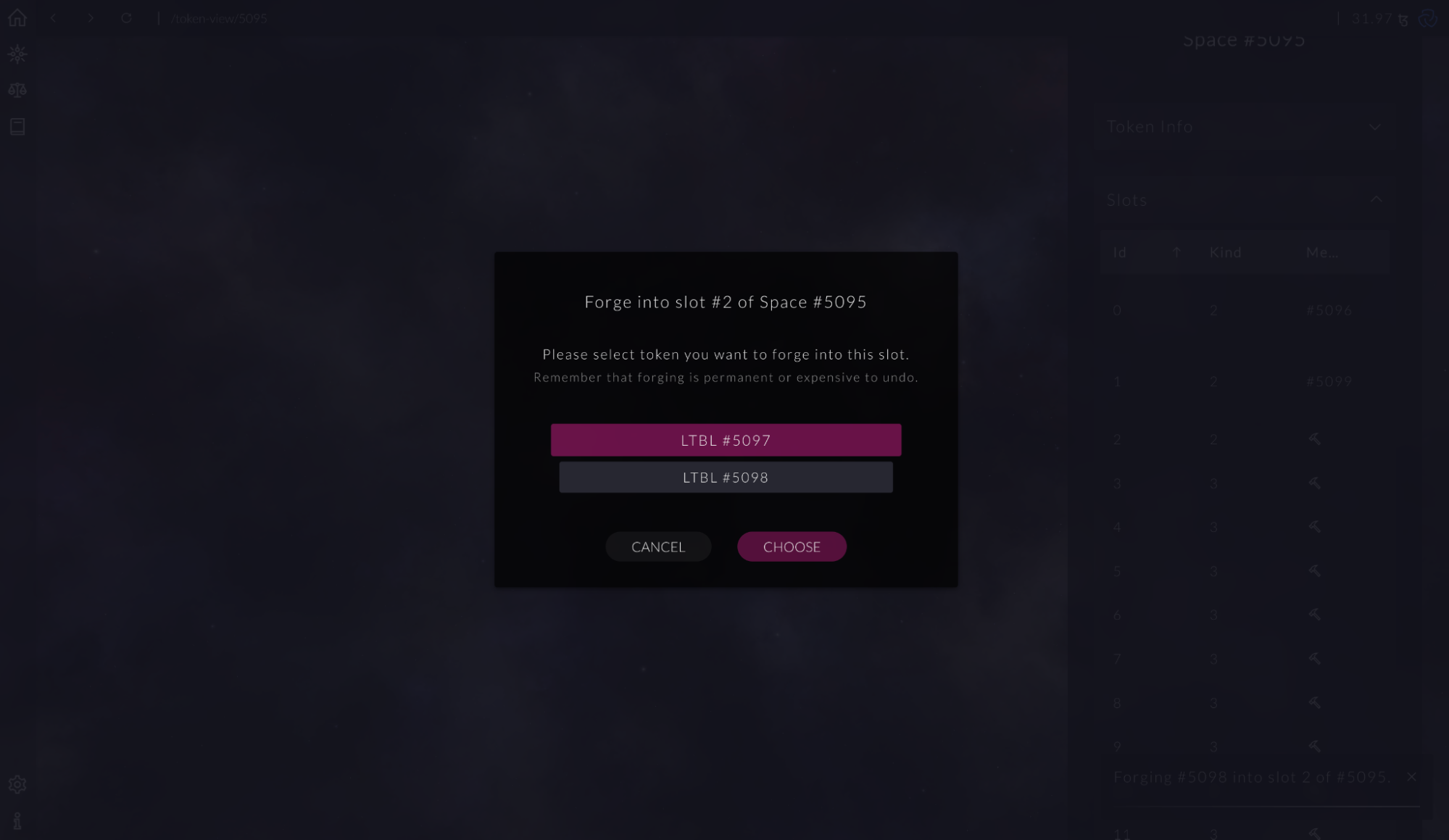 У цьому списку виберіть будь-який слот зі значенням Kind 2 та натисніть іконку з молотком. Виберіть будь-який токен і натисніть кнопку Forge.