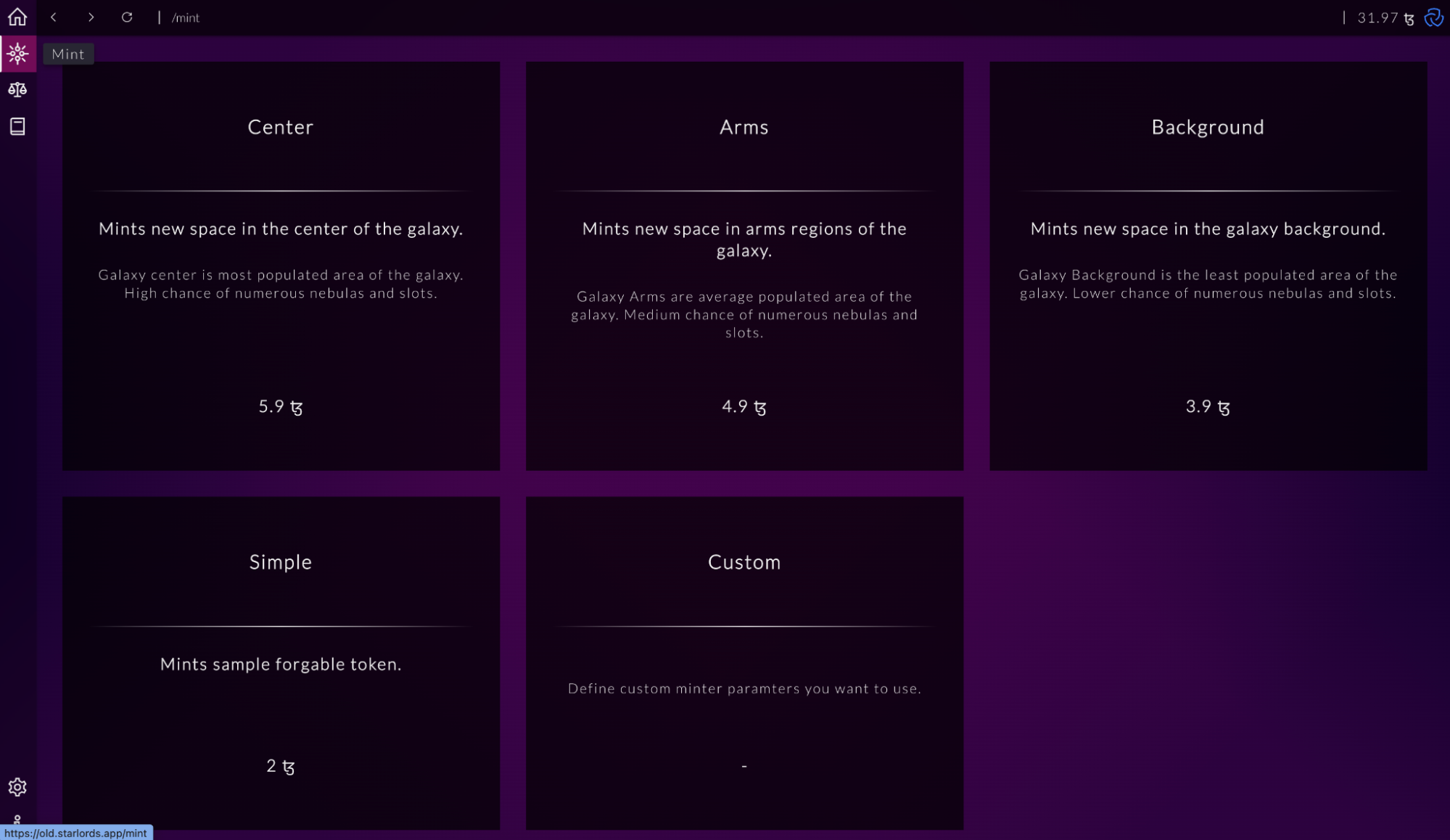 Потім зайдіть в Starlords App. Перейдіть на вкладку Mint з іконкою у вигляді зірочки і змінтіть будь-який з верхніх трьох токенів: Center, Arms або Background.
