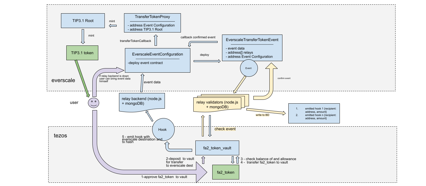 Користувач відправляє FA2-токени до сховища, валідатори реле підтверджують депозит, контракт на Everscale створює таку ж кількість токенів стандарту TIP3.1 та відправляє їх користувачеві.