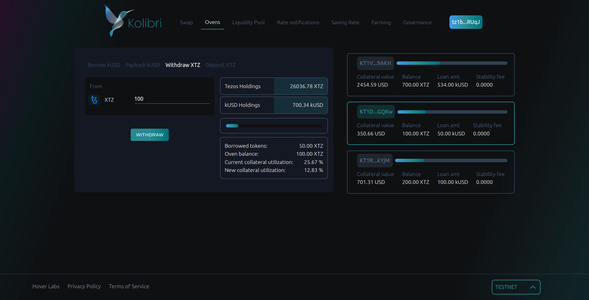- печі Kolibri — адресу контракту, забезпечення та кількість випущених kUSD.