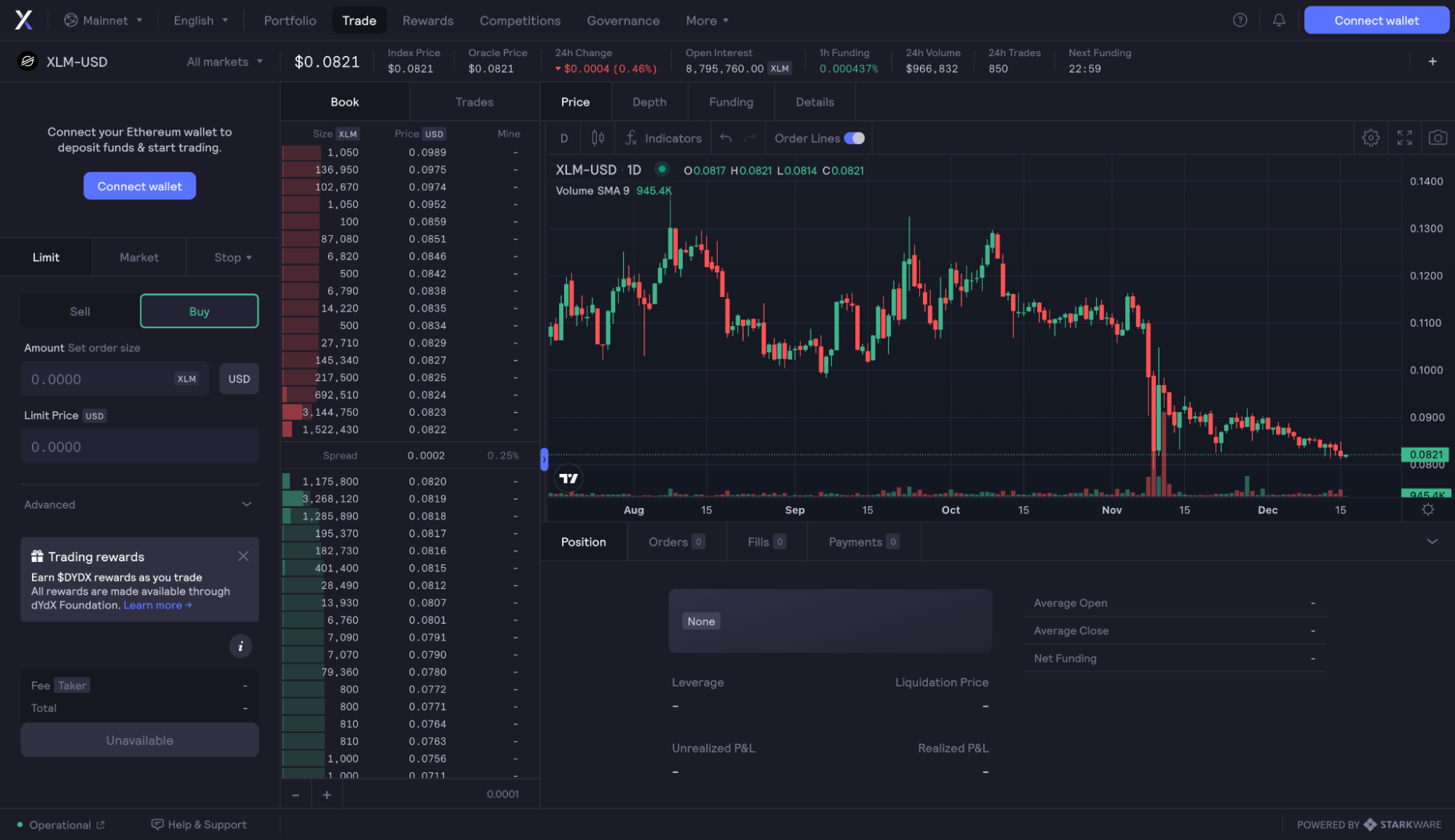 dYdX — децентралізована платформа для торгівлі безстроковими ф’ючерсами з плечем 20х. Вона приймає депозити на смарт-контракт та виконує угоди в ZK-ролапі, хоч і зберігає книгу ордерів на централізованому сервері.