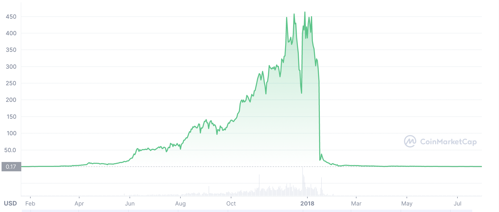 Але в січні 2017 року, коли курс XEM становив $1,8, біржа Coincheck оголосила про крадіжку 500 млн токенів вартістю близько $700 млн. Після цього ціна XEM впала до $0,05.