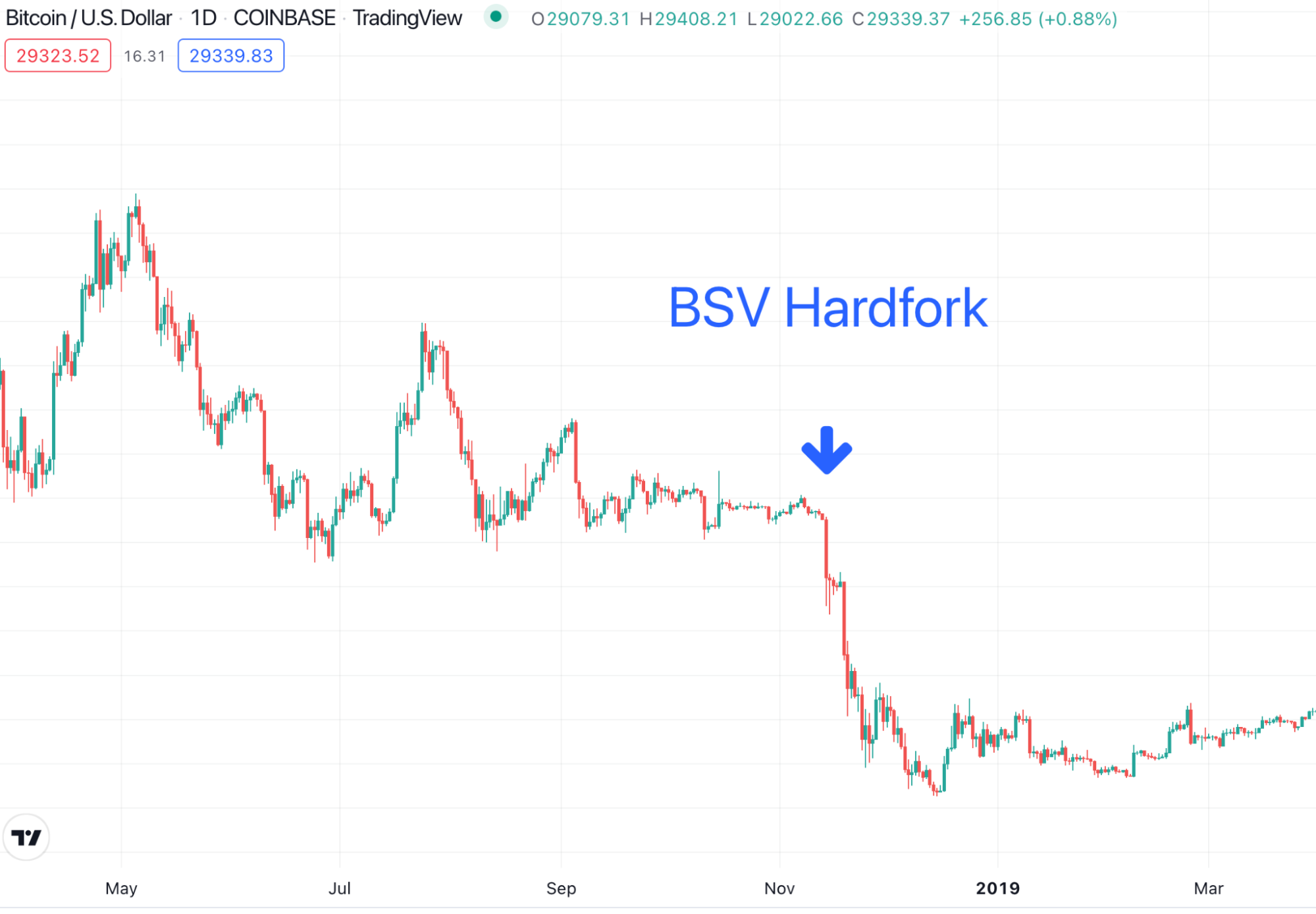 Створення BSV та скандали навколо хардфорків підкосили крипторинок. У листопаді 2018 року ціна біткоїну пробила підтримку на рівні $6000 і майже півроку залишалася в районі $3500. Тільки у квітні 2019 року ринок зміг відновитися.
