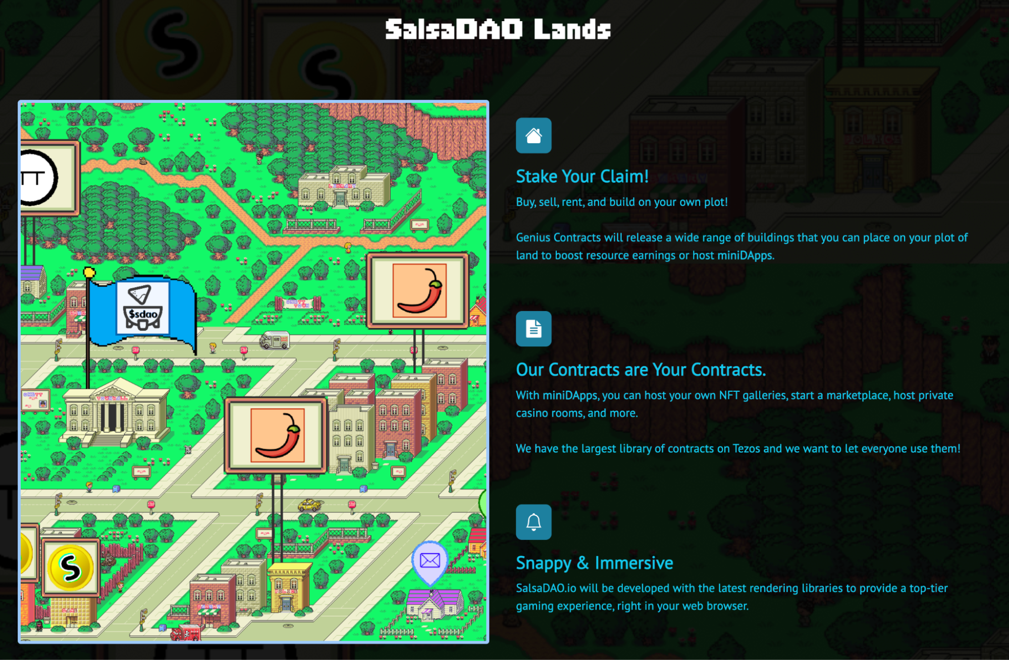 Ще планується до запуску SalsaDAO.io: з продажем землі, будівництвом будівель-додатків зі своїми юзкейсами, комісіями та іншими атрибутами реального світу.