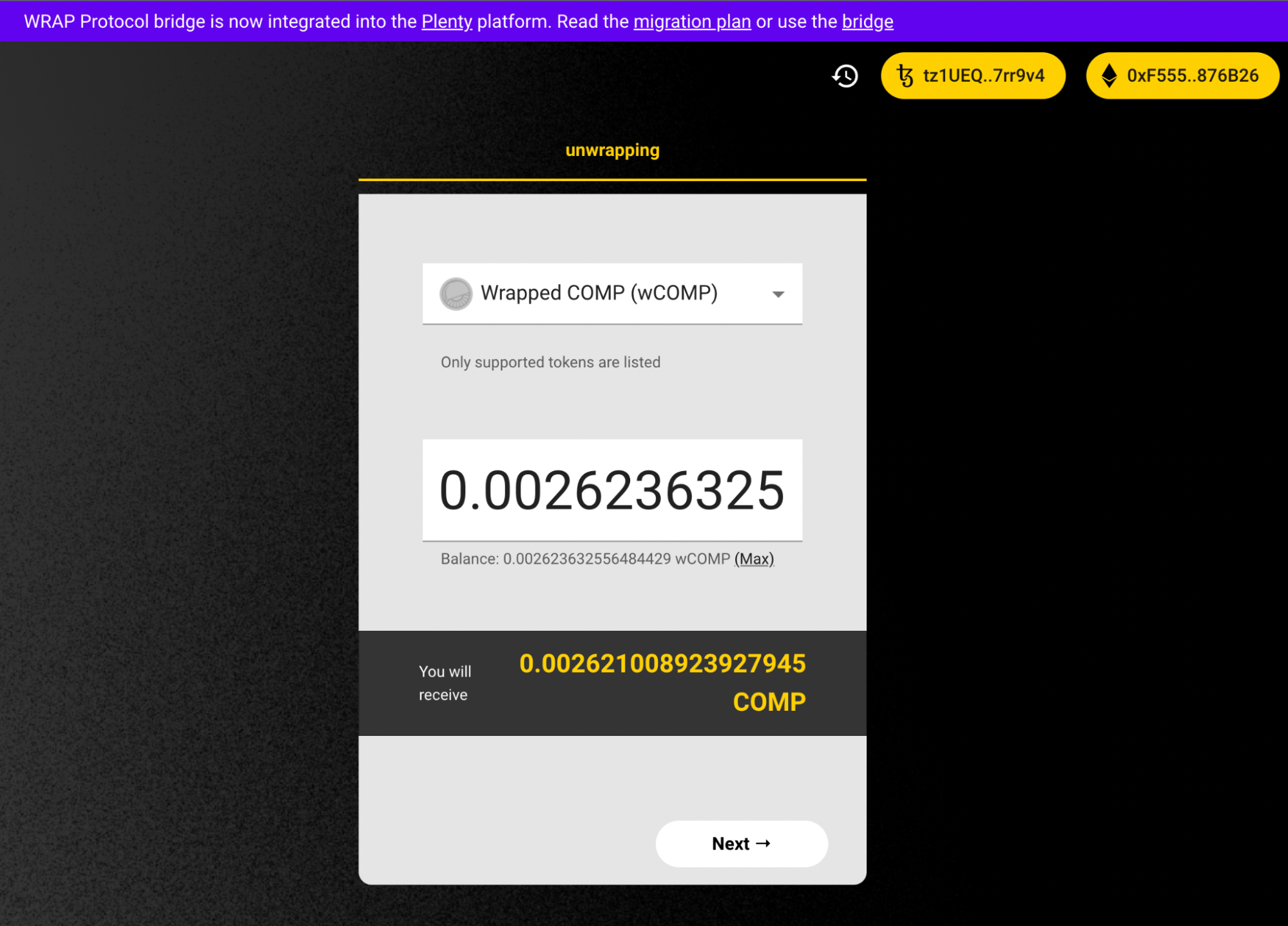 Swapping Wrap Protocol Tokens on Plenty Bridge