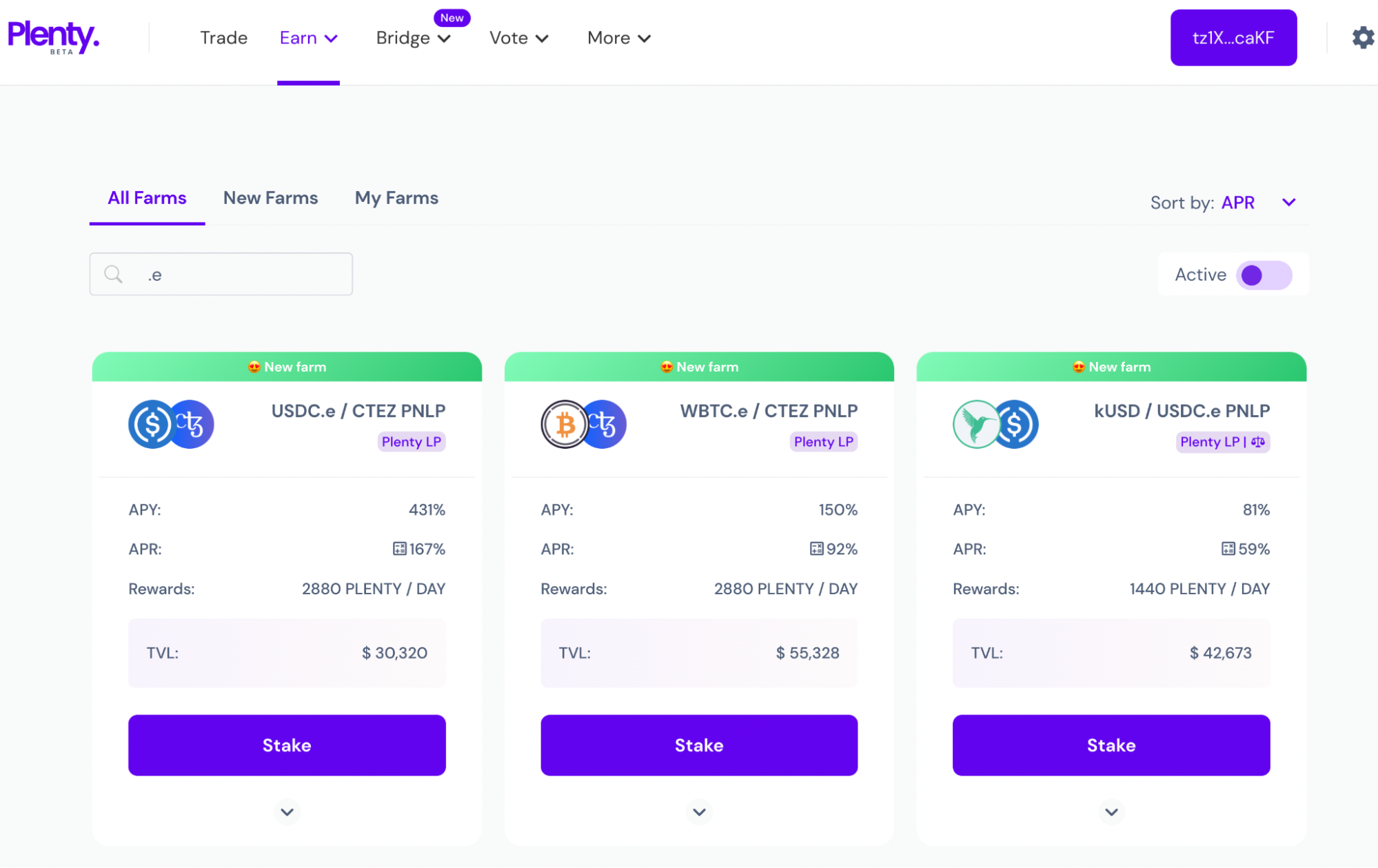 Plenty has already opened five farms for PLENTY token mining. You need to add the appropriate assets to the liquidity pool, get LP-tokens, and put them into the farm. Yields range from 19% to 431% APY.
