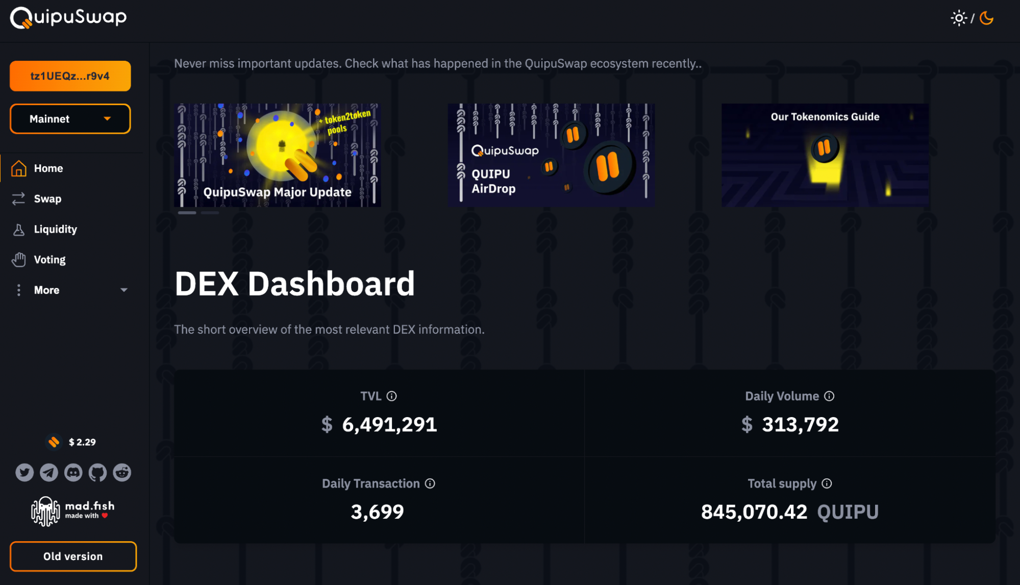 The most noticeable change is the new interface and logo. The old version of QuipuSwap immediately opened the token exchange, whereas the new one has a dashboard with news, exchange statistics, and a list of the most popular trading pairs. You can also switch the day and night themes using the button in the upper right corner.