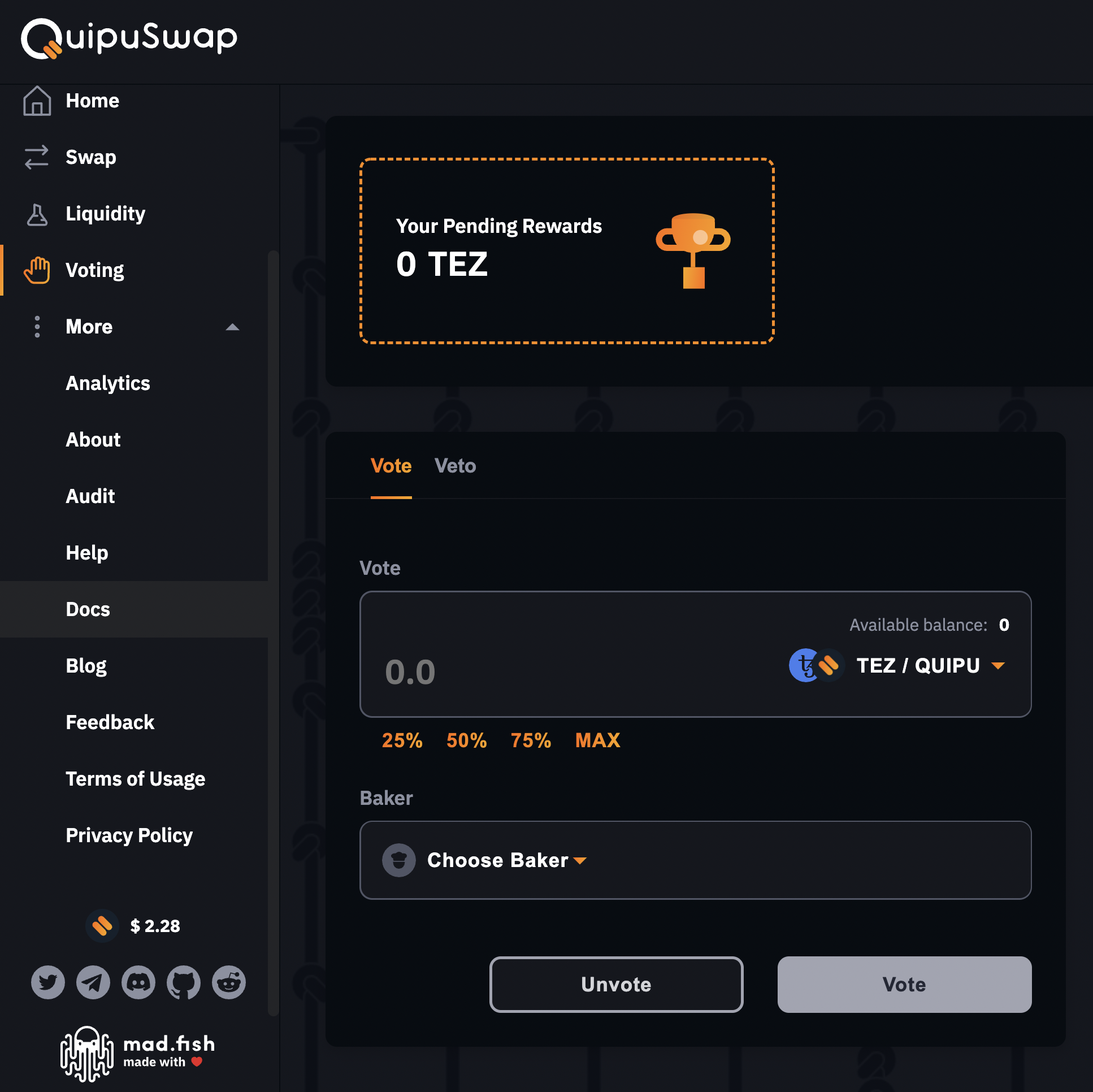 Buttons for switching to exchange tabs, managing liquidity, and voting for a baker are on the left-hand side of the screen. Below is the More button with a list of useful resources, the price of the QUIPU token, and links to Madfish Solutions social networks.