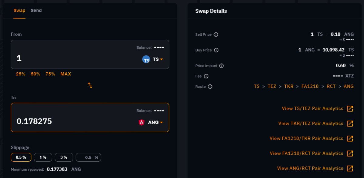 You have to pay a 0.5% transaction fee per swap for routing. At the time of publication, Temple is using QuipuSwap and Plenty pools, as well as Liquidity Baking pool (tez/tzBTC) and Youves Flat Curve Function Market Maker (wUSDC/uUSD and other asset pairs with the same value).