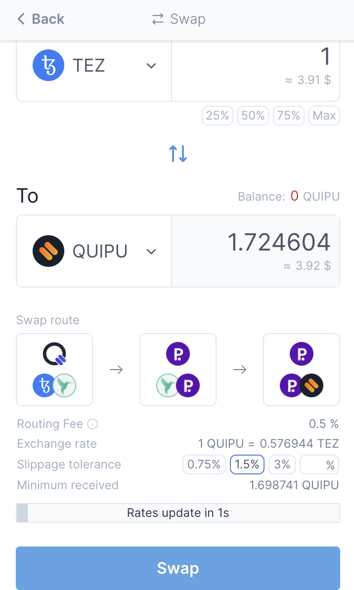 Temple now supports exchange routing across different DEXs. Once you select the tokens, the wallet will check the pools of decentralized exchanges on Tezos and build the most profitable route.