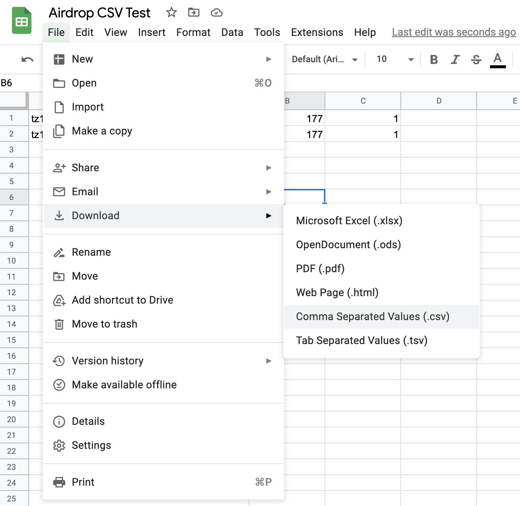 Then go to File → Download → Comma Separated Values (.csv).