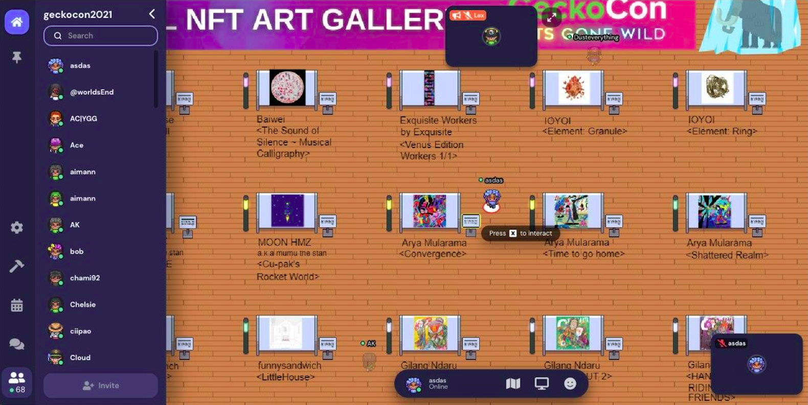 Для трансляції воркшопів CoinGecko використав майданчик Gather.town. Користувачі створювали своїх аватарів та досліджували головний хол із виставковою залою. Потім вони заходили до кімнати та підключалися до трансляції.