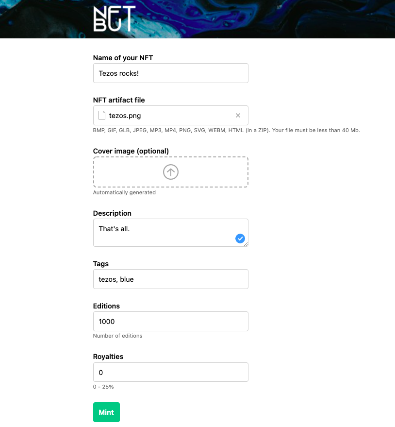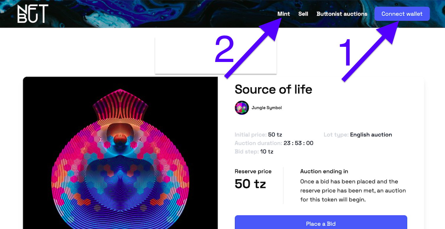 Процес створення NFT більшості маркетплейсів виглядає однаково. У прикладі показано мінтинг на маркетплейсі NFT Button.