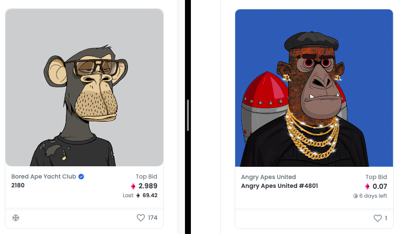 У NFT-індустрії все так само: популярні колекції торгуються і зростають у ціні, а токени «випадкових» художників — ні. Наприклад, вартість NFT із розрекламованої Bored Ape Yacht Club починається з 3 ETH ($12 тисяч), а дуже схожих мавп із Angry Apes United — із 0,07 ETH ($300).