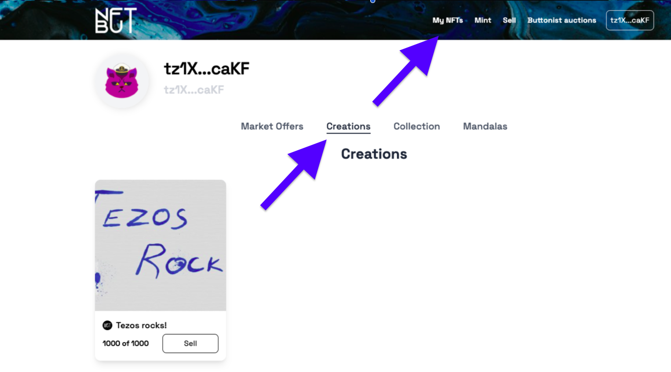 Натисніть My NFTs, щоб відкрити профіль. Створені NFT відображаються у вкладці Creations.